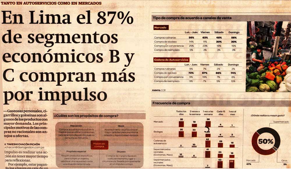 Para sustentar este análisis, revisemos el Diario Gestión del 22 de Marzo del 2013, página 2, cuyo encabezado dice: “En Lima el 87% de segmentos B y C compran más por impulso”, señalando luego que las gaseosas, golosinas y cigarrillos son los productos de mayor demanda y que este comportamiento obedece a una compra no racional o no planificada;
